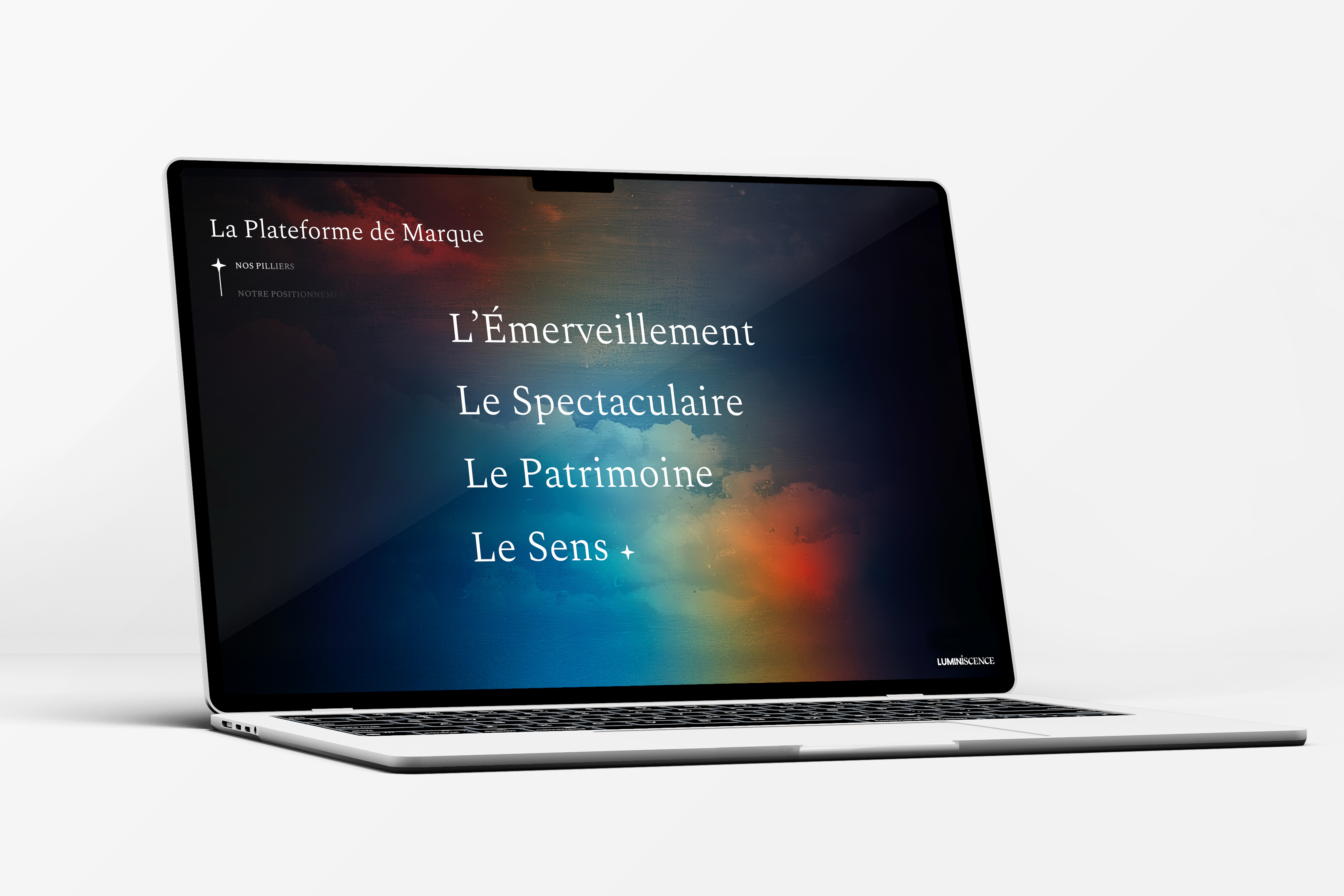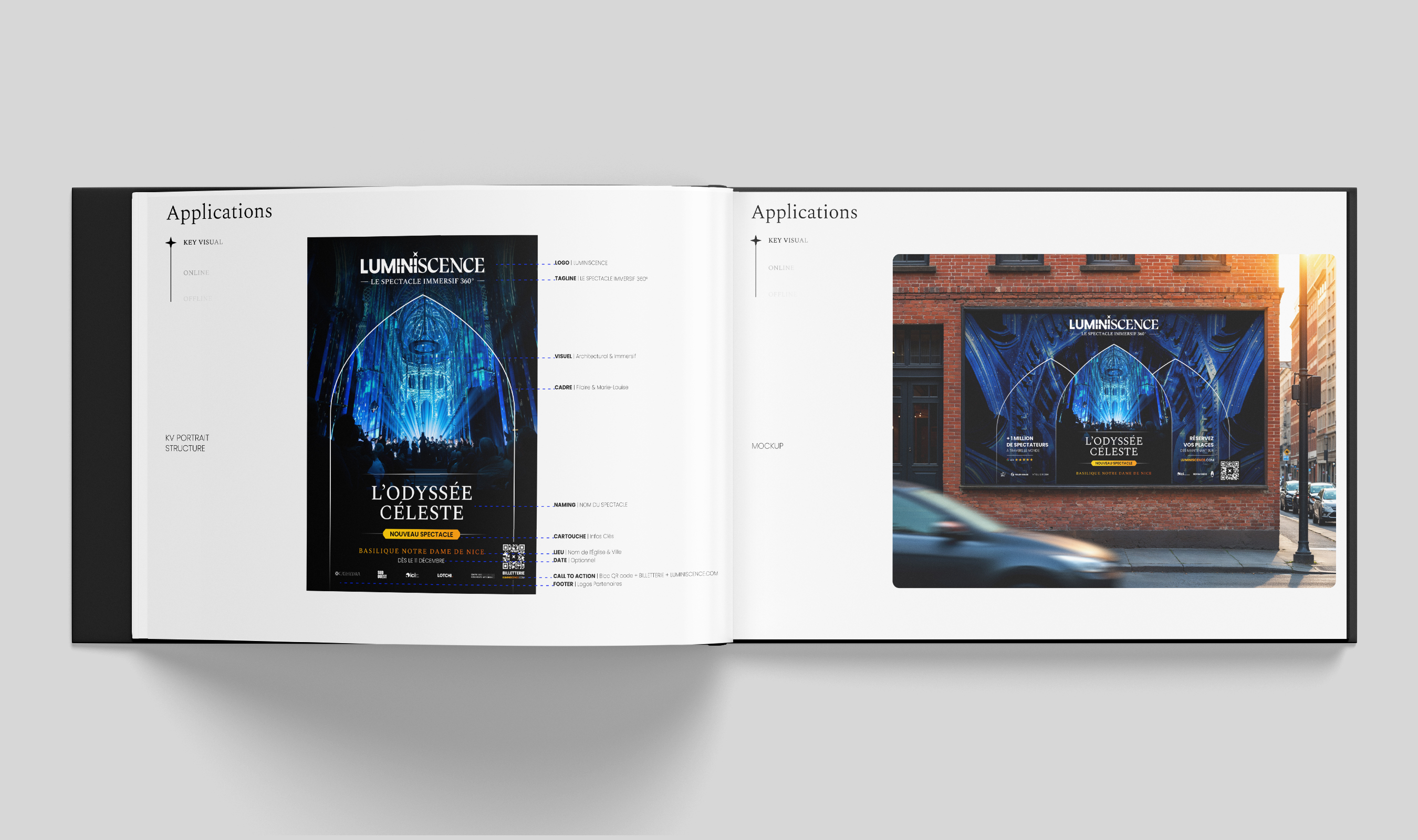 Dans le cadre de l’expansion des spectacles de mapping visuel Luminiscence en France et à l’international, IMPRODSTUDIO a accompagné les équipes dans la structuration globale de la communication de marque. Le projet a porté sur la définition de la plateforme de marque, positionnement, piliers et principes narratifs, afin d’assurer une cohérence durable sur l’ensemble des territoires. En parallèle, une charte graphique a été développée en collaboration avec la direction artistique de la marque pour poser les fondations de son style visuel. Sur cette base, les supports de communication des nouveaux spectacles ont été conçus : Key Visual, déclinaisons on et offline (OOH, presse) et contenus pour les réseaux sociaux, en parfaite cohérence avec la plateforme et la charte. L’ensemble a été rassemblé au sein d’un Brandbook pensé comme un outil de référence, permettant aux équipes locales de déployer les spectacles dans différentes villes tout en respectant un système de design et d’expression commun.