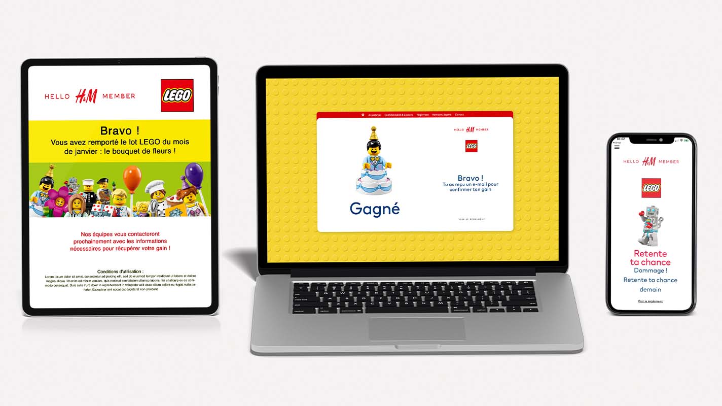 H&M propose à ses membres Hello Members de tenter de gagner des cadeaux LEGO grâce à un Instant Gagnant clé en main. Chaque membre peut jouer tous les jours depuis son espace fidélité, transformant l’expérience en un rendez-vous amusant et motivant. IMPRODSTUDIO a conçu un mini-site responsive simple et intuitif, respectant les chartes LEGO et H&M, avec gestion automatisée des gagnants et mises à jour des dotations. Un dispositif complet qui mêle digital, fidélisation et plaisir de jouer, pour créer de l’engagement à chaque connexion.