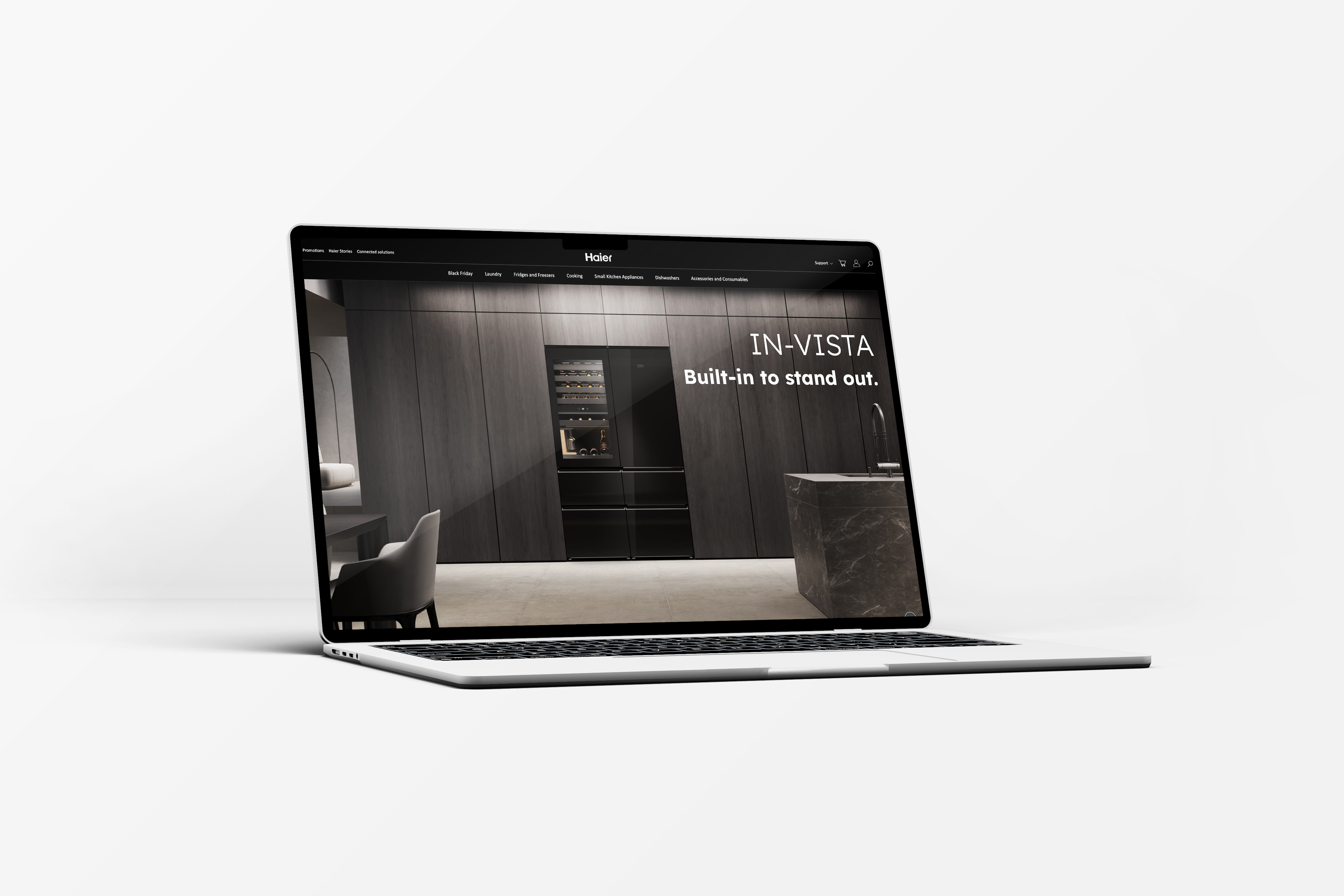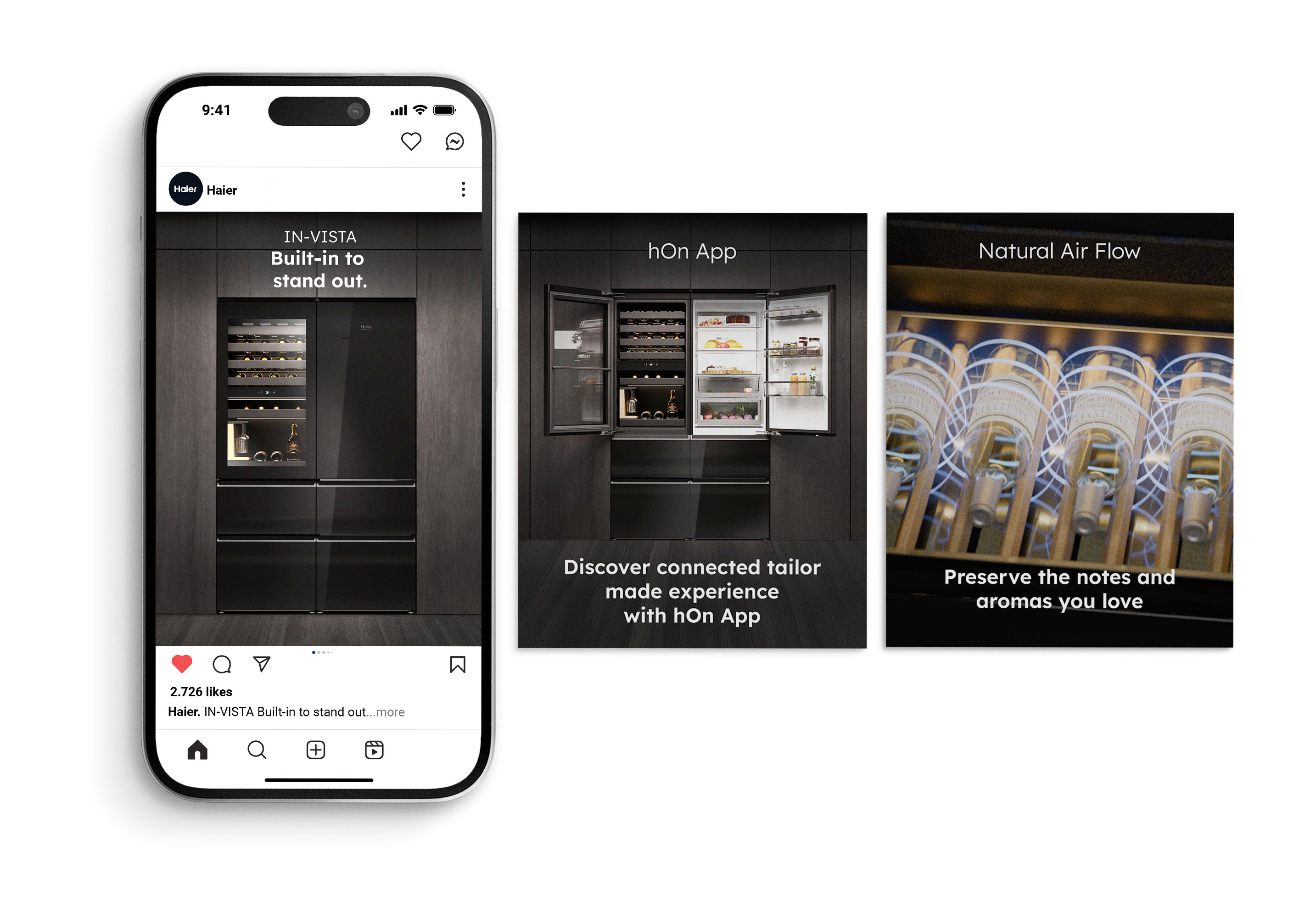 In-Vista est un réfrigérateur 2-en-1 innovant qui associe cave à vin et double congélateur, tout en offrant une intégration digne de l’encastrable malgré une pose libre. Le projet a porté sur la conception des masters de communication print et web, incluant un Key Visual entièrement réalisé en full 3D, des vignettes valorisant les caractéristiques clés, ainsi que le parcours des landing pages dédiées à chaque déclinaison du produit. Le dispositif s’est décliné en social media à travers des posts et carrousels orientés awareness et conversion, mettant en avant l’intégration en cuisine, les technologies embarquées et la connectivité avec l’application hOn, ainsi qu’en bannières statiques et animées aux formats IAB pour les campagnes média digitales. L’ensemble des supports a été conçu en anglais afin de permettre leur localisation sur les différents marchés européens.