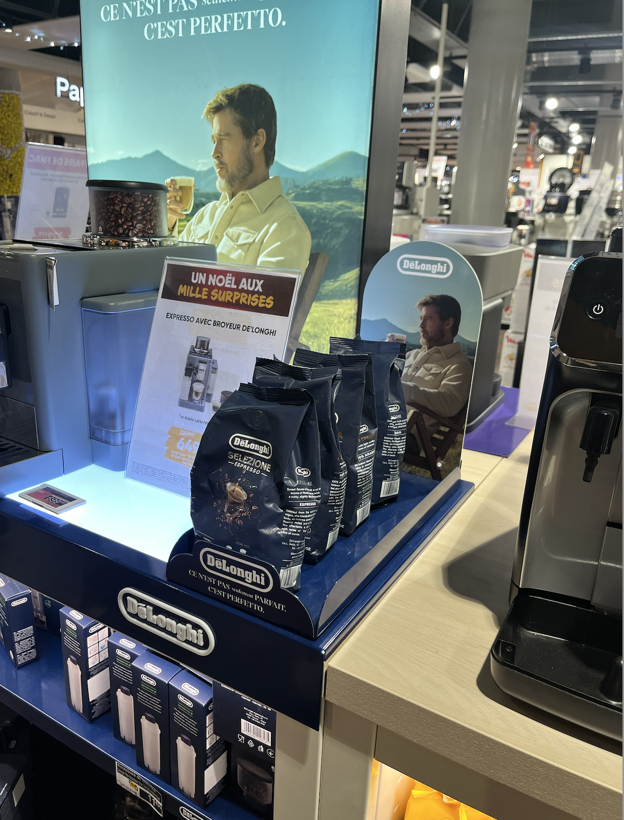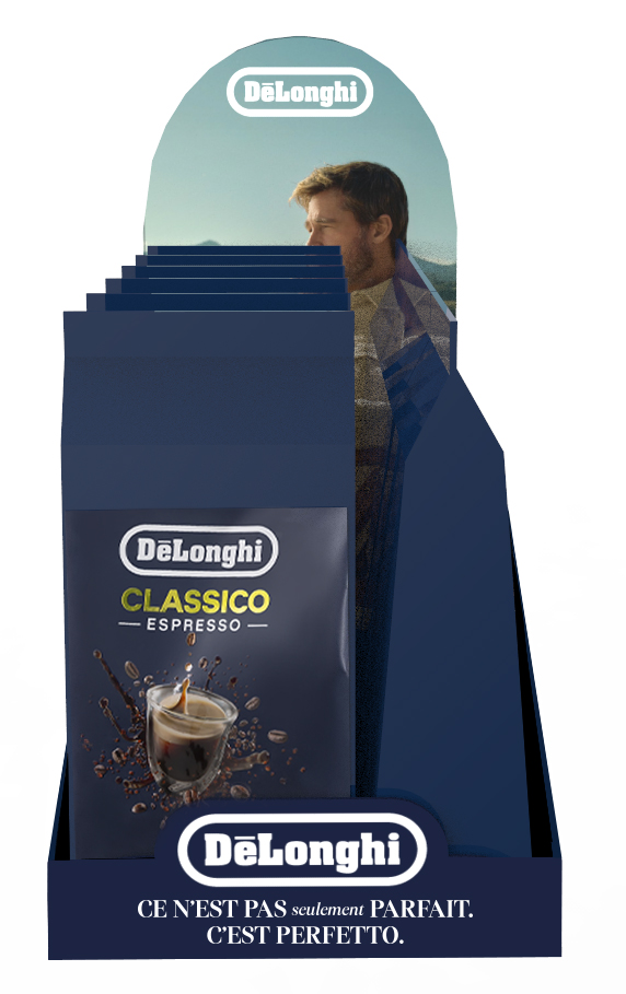 Dans le cadre de ses projets retail, Delonghi a confié a IMPRODSTUDIO la création de visuels sur mesure pour une sélection de produits, afin d’imaginer les mises en scène en magasin. L’objectif était de produire des supports adaptés au point de vente, qu’il s’agisse de frontons, de meubles, de bulletins d’offre ou de présentations pour un lancement produit. Ces supports sont conçus par le studio puis transmis pour impression et déploiement en magasin, avec la possibilité de présenter aux clients la simulation 3D finale.