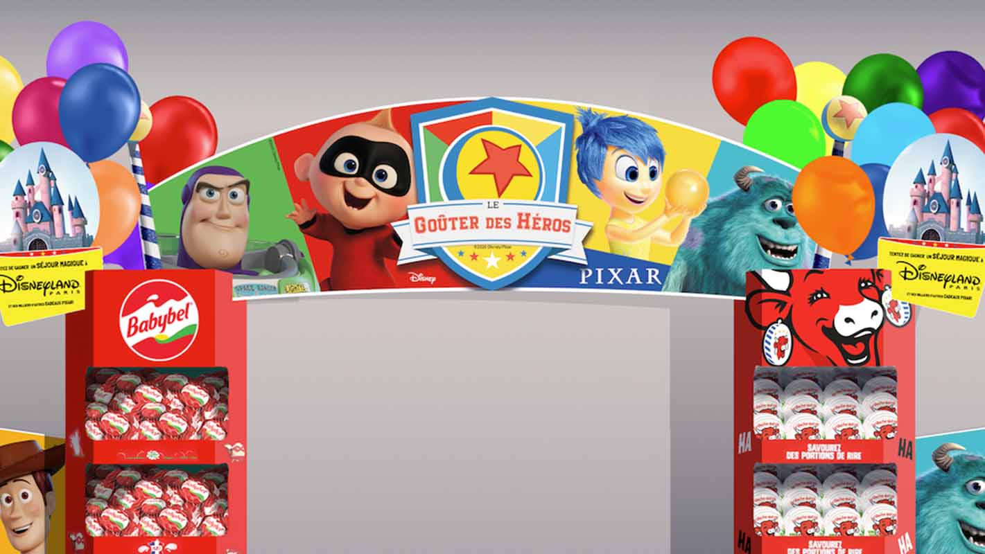 IMPRODSTUDIO a conçu et produit l’identité visuelle complète de « Le Goûter des Héros », déployée simultanément sur les marques La Vache qui rit, Babybel et Kiri. La mission comprenait la création de l’univers visuel, la définition des palettes de couleurs et la sélection des personnages Pixar clés pour un partenariat transversal, multimarques et multiproduits. Le dispositif a été prolongé en point de vente grâce à une PLV complète : stop-rayons, stickers de sol, cubes et mâts promotionnels, silhouettes de personnages, frontons, habillages de box palettes et arches événementielles, structurant les espaces promotionnels en supermarché. L’expérience s’est également étendue au digital avec la création d’un mini-site, d’un jeu concours (séjours à Disneyland Paris et goodies) et d’une collection de coloriages Pixar brandés BEL, assurant une continuité on et offline.